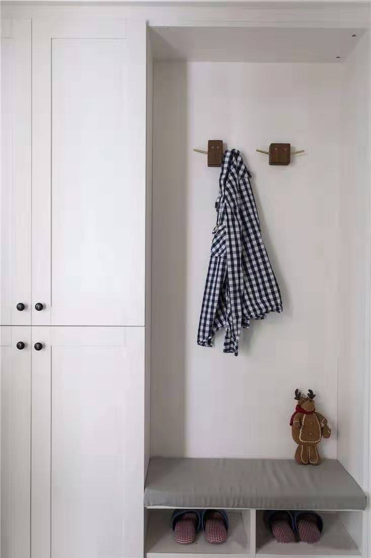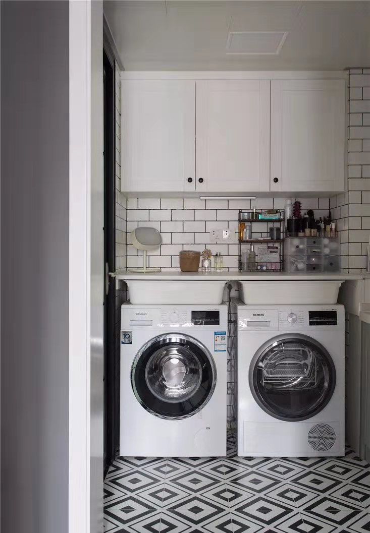 將洗衣機和烘干機位置設(shè)計在收納柜下,使空間得到充分的利用。
