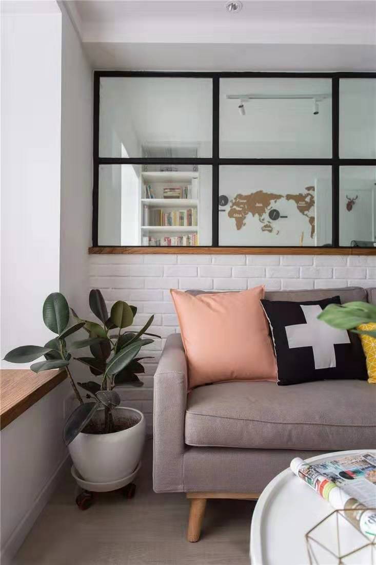 客廳,設(shè)計師采用黑框玻璃的設(shè)計,在增加整個空間通透感的同時,又可提升書房的采光。