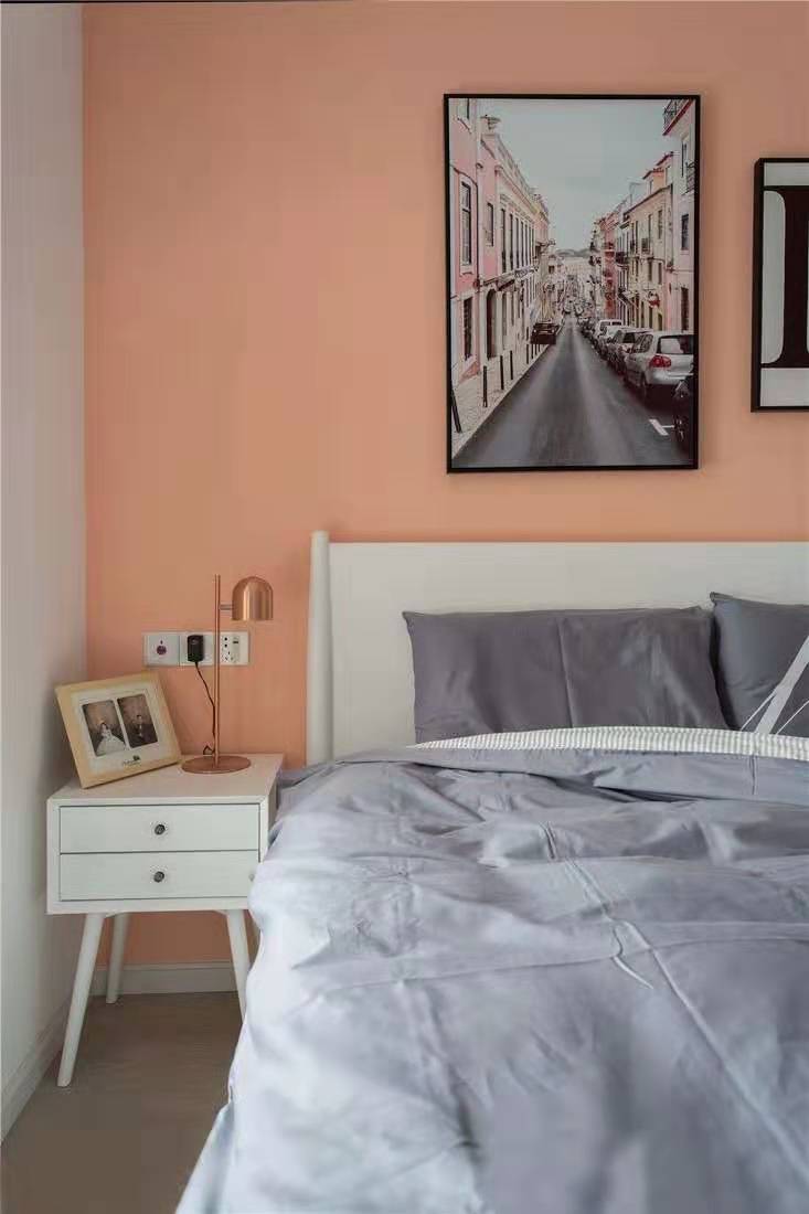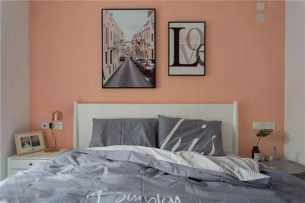 床頭背景墻的裝飾畫具有視覺延伸的效果,增強了空間層次感。
