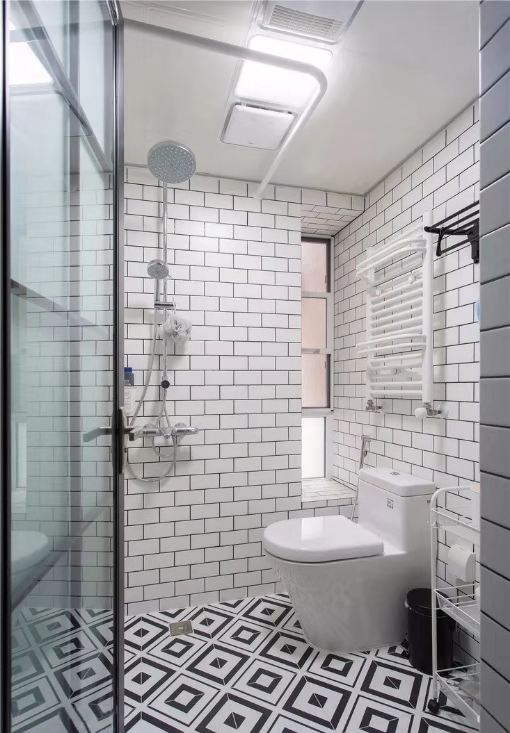 衛(wèi)生間干濕分區(qū),大大提高了效率。大面積使用黑白灰,墻面以面包磚排列,使得干區(qū)洗漱間顯得干凈整潔。